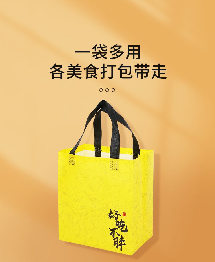 • 环保性:无纺布覆膜外卖袋是一种环保产品,客户在选择材质和设计时,应考虑到环保因素,尽可能选择可回收、可降解的材料。